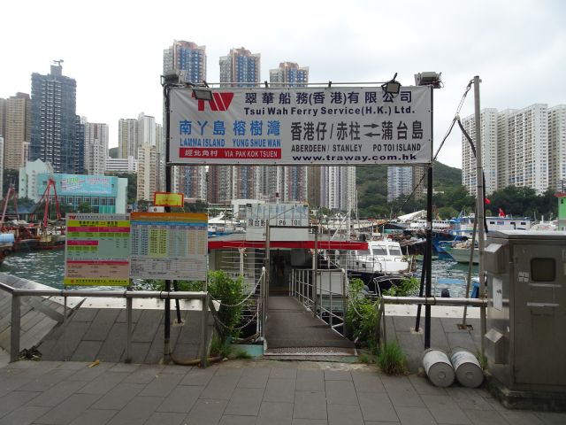 Aberdeen to Pak Kok Tsuen and Yung Shue Wan (Lamma Island) ferry at Aberdeen Promenade. The service is operated by Tsui Wah Ferry Co