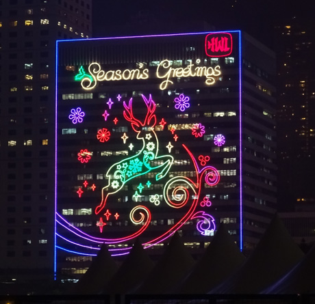 Illuminated seasonal greetings, seen from the harbourside, displayed on the façade of Hutchison House, Central