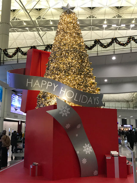 Festive display in the arrival hall of Hong Kong International Airport for Christmas 2018