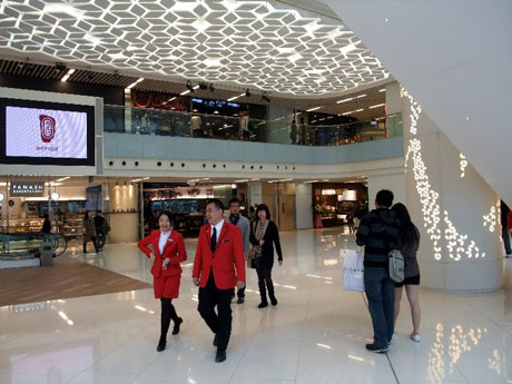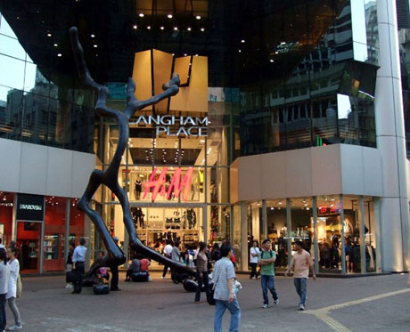 Located in the heart of one of Kowloon’s busiest districts Langham Place is a 15-storey “vertical” shopping mall, supermarket, cinema, 665-room five-star hotel and 60-storey office development. The complex was opened in late 2004 and originally owned by Great Eagle Developments but in 2008 the shopping mall and office tower were purchased by Champion REIT with Great Eagle retaining ownership of the hotel. Major features of the shopping mall are the huge glass Grand Atrium with giant video screen, a bronze “stick-man” sculpture known as “Happy Man” and Hong Kong’s longest indoor escalators “Xpresscalators” directly connecting levels 4 and 12 and “Digital Sky” in which computer generated images are projected onto the ceiling above the level 13 dining area and “Spiral Stars Gallery” with mainly young fashion shops on levels 8 to 13. There are over 160 retail shops offering fashion, sportswear, accessories, shoes and bags, jewellery and watches, beauty and skincare products, personal and healthcare, audio/visual, electronics and telecommunications, music, toys and gifts. The flagship store is HK Seibu Department Store on levels 1 and 2 and other major stores include H&M, Muji, AIX Armani Exchange, Calvin Klein, French Connection, IT, Levi’s, Bauhaus, Adidas, Columbia Sportswear, Marathon Sports, Isabella, Millie’s, Staccato, MaBelle, Tissot, Aveda, Giffarine & Pattrena, L’Oreal Paris, Maybelline New York, Genesis, Snoopy and CD Warehouse. At Basement 2 level is Market Place by Jasons Supermarket. There are over 45 food outlets including in “The Ozone” dining area on level 13 Mr Steak Café, Kaleidoscope, Simply Thai and Tapaz. Other café’s/restaurants include Ajisen Ramen, Genki Sushi, Euro Go Go, Guangzhou garden, Korea House, Saint’s Alp Teahouse, Starbucks and Shang Shang Shanghai Cuisine. In the office tower at levels 6 to 9 are Pure Fitness and Pure Yoga Suites. The six-screen multiplex UA Cinema is on level 8. For directory of shops and food outlets see the Langham Place website.