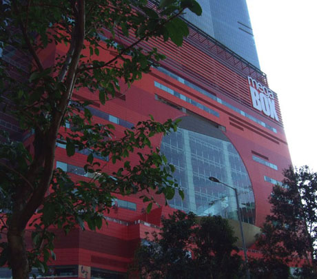 Megabox's distinctive red exterior which is clearly visible from across the harbour on Hong Kong Island