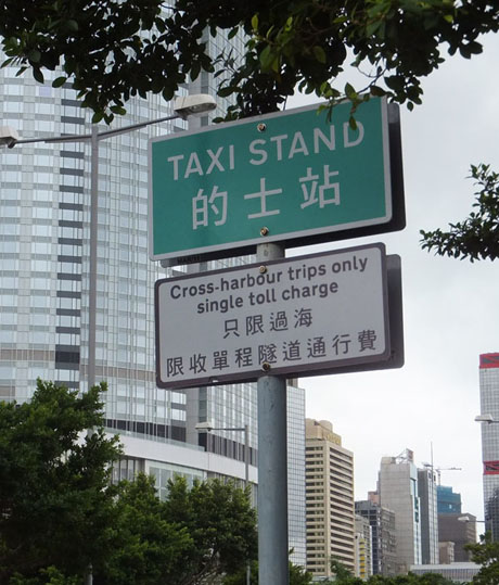 Cross-harbour taxi stands are clearly marked and avoid return tunnel toll being charged. The stand shown is located at Man Kwong Street, Central outside Central Pier 5