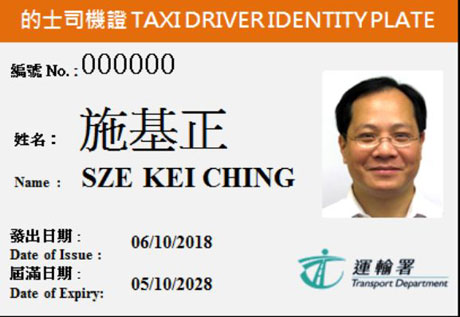 All taxi drivers are required to display a taxi driver identity plate. In October 2018 a new taxi driver identity plate was introduced with a validity period of ten years to replace the previous plate which was only valid for one year. The new plate is being rolled out following requests from taxi and Public Light Bus trades for a longer validity period of driver identity plates, and as one of the facilitation measures put forth in the report of the Public Transport Strategy Study released in June 2017. Existing one-year plates will continue to be valid until their expiry date.