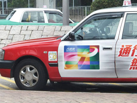 Some taxis accepting Octopus Card payment display the Octopus logo on the front passenger doors