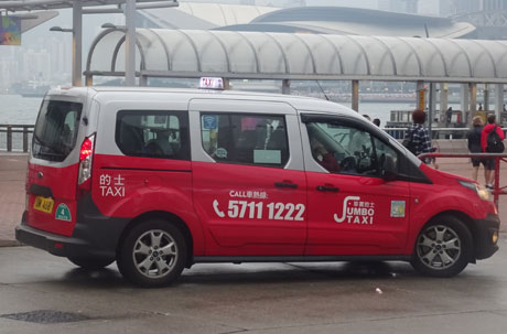 Wheelchair accessible taxis are operated by Diamond Cabs and Chung Shing Taxi Co. Diamond Cabs, which operates as a social enterprise, operates seven Toyota Noah Welcabs which are designed for wheelchair access with a mechanical ramp at the rear. These cabs must be pre-booked. A further 200 Nissan SynCab taxis, operated by Chung Shing Taxi, capable of carrying passengers in wheelchairs are eventually expected to be in service. The first 20 (15 red urban taxis and 5 green New Territories taxis) were commissioned in February 2015 and by April 2017 the company had about 140 SynCabs in service. The SynCab taxis have four seats, a large trunk with capacity for up to eight large bags and are equipped with wi-fi and USB ports.The taxis must also be pre-booked either by phone or SynCab mobile app. Normal rate per km applies but there is a HK$60 booking fee. Cash or credit card can be used for fare payment. PrimeCab Hong Kong also operates more than ten larger capacity Ford Transit Connect taxis. In December 2016 Jumbo Taxis, a partnership between Future Motors and taxi operator Chow Kwok-Keung, was launched with a fleet of 40 Ford Connect Transit vehicles, capable of holding up to nine pieces of luggage, and equipped with free Wi-Fi and a mobile phone charging service for passengers. The taxis are also equipped with devices to monitor driving habits and deter drivers from taking longer routes. The Jumbo fleet had expanded to 70 taxis by April 2017. Taxis can be hailed on the road but a booking fee of HK$50 applies for bookings via a hotline. The company is targeting corporate clients and business passengers and will not offer wheelchair access.